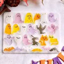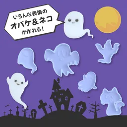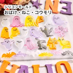 ゆるい表情に癒される、ハロウィンにぴったりのおばけや猫のパーツ作りはいかがですか?ハロウィンモチーフのおばけ、猫、コウモリを全部で24種作れるシリコンモールドです!