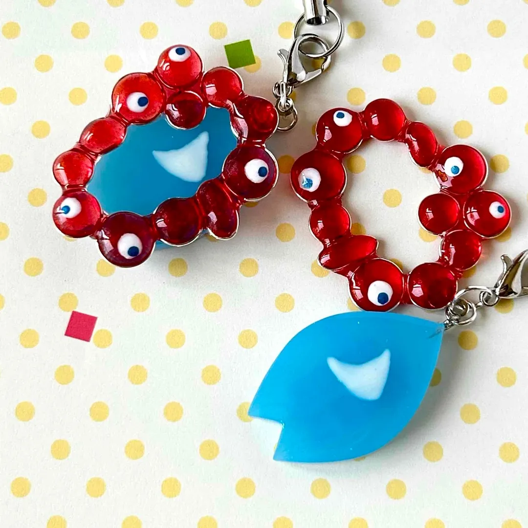 • 4最後に、レジン液が固まったら、青色の桜の花びらを重ねてミャクミャク様の顔に見えるようにするにゃ。完成にゃ!