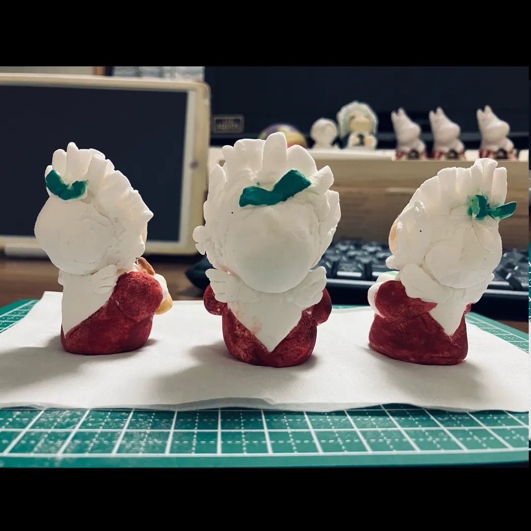 粘土を整形 他にもパーツ分けしたかったら日にちを分けての作業をおすすめします ↓ 乾いたら色塗り 今回は粘土をいじっている間に乾いた部分から塗りました ↓ 塗装を乾かして完成 必要であればニスなどを塗ってもいいかもしれません